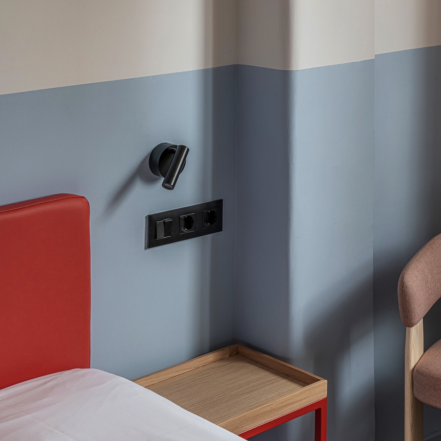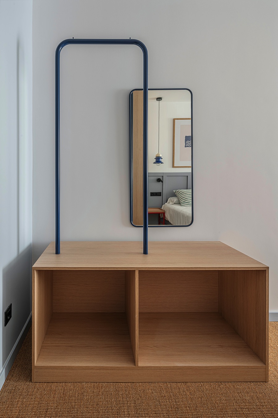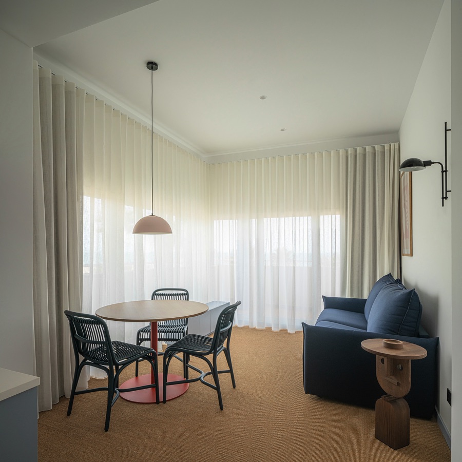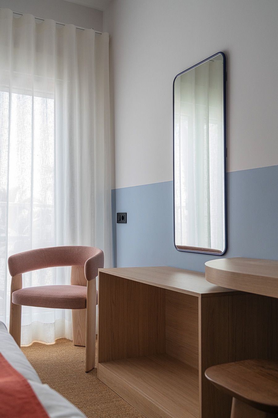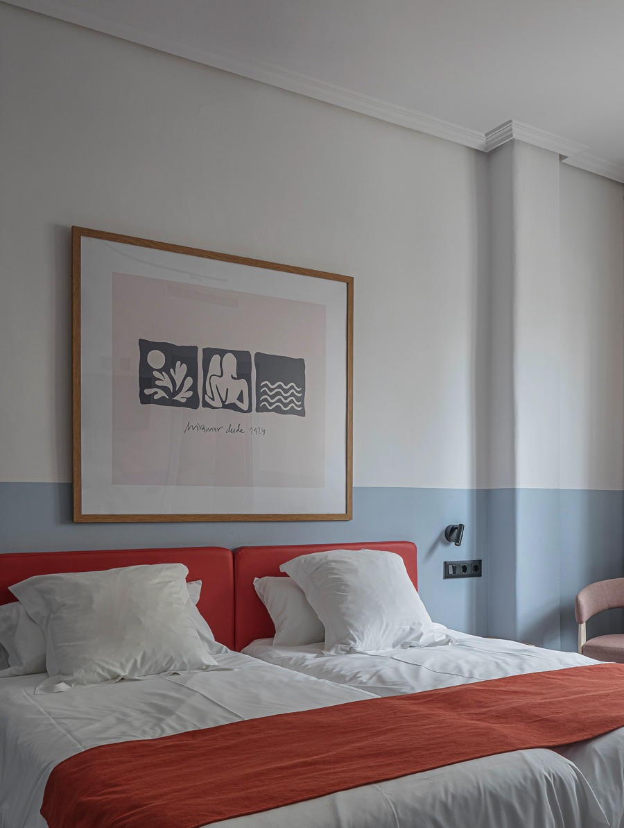 El Hotel Miramar, se inspira en una estética marinera que evoca la serenidad y el encanto del mar. Los colores predominantes son el azul medio y marino, combinados con blanco y rojo, complementados con detalles en madera. Esta paleta crea un ambiente acogedor y vibrante. Cada espacio del hotel, desde las habitaciones hasta las áreas comunes, refleja esta temática náutica con un diseño fresco y elegante, ofreciendo a los huéspedes una experiencia única y relajante junto al mar.