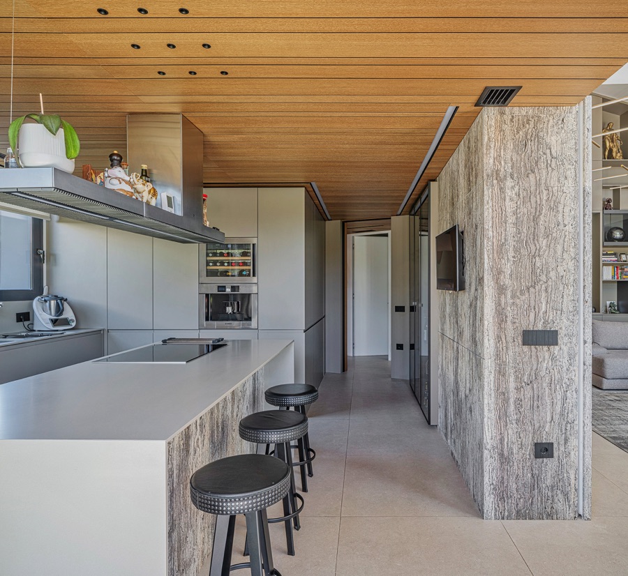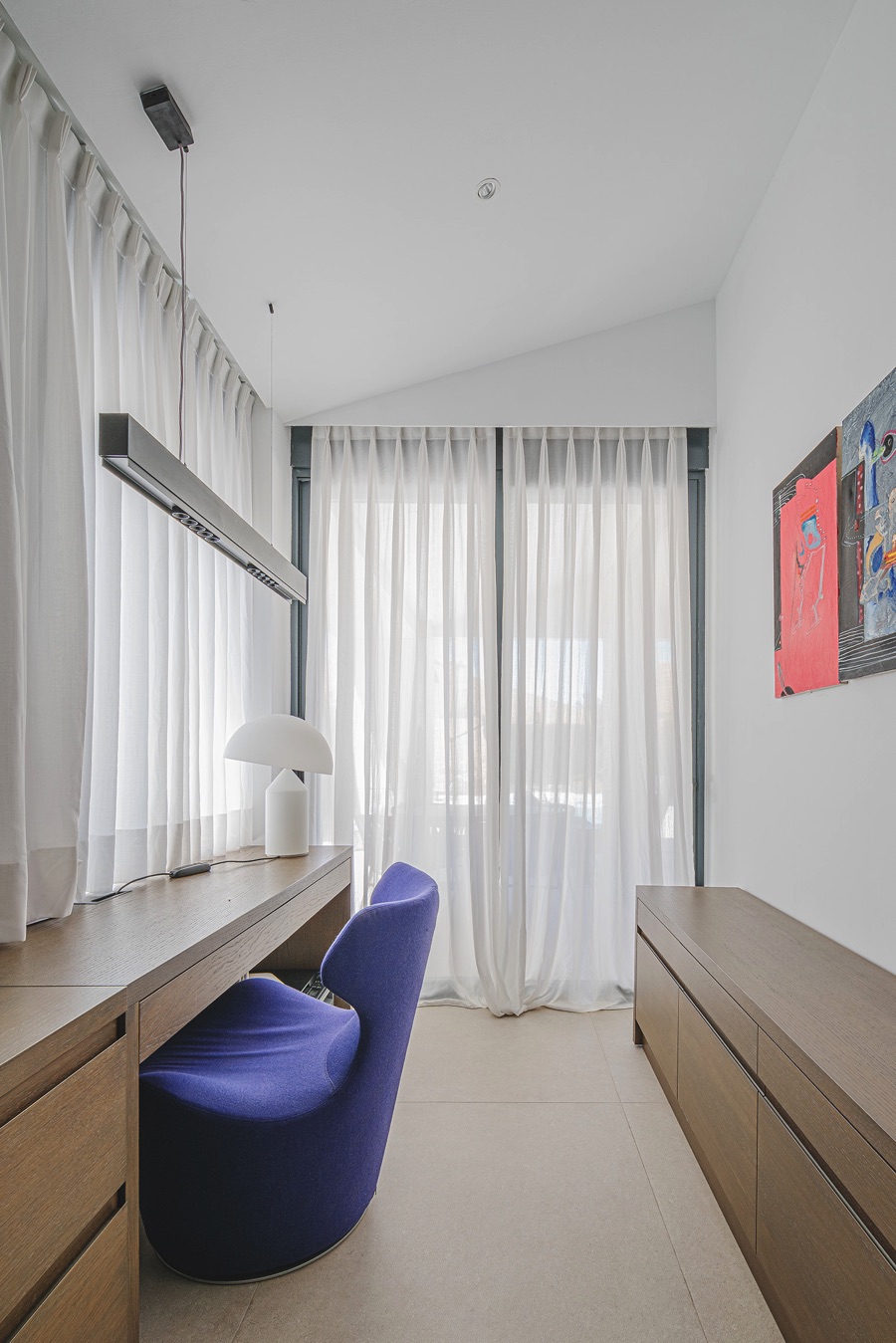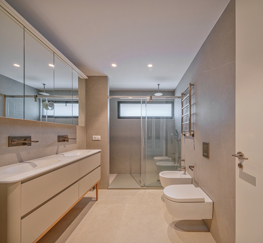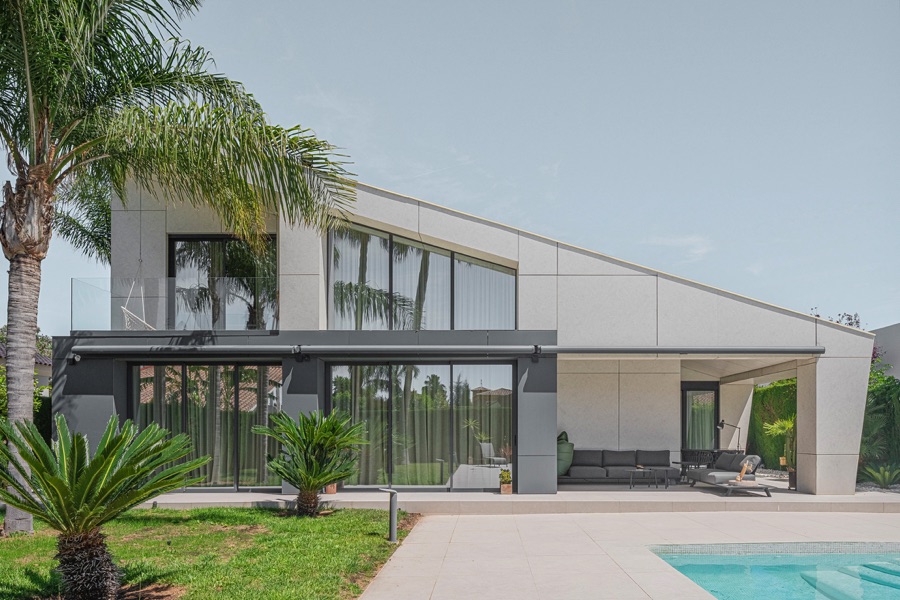 La renovación exterior incluye una fachada ventilada con elegantes placas TRESPA, combinando estética y durabilidad. Además, se ha mejorado la eficiencia energética mediante avanzados sistemas de aislamiento térmico y la instalación de placas fotovoltaicas, que contribuyen a la autosuficiencia energética. Este enfoque integral no solo moderniza la vivienda, sino que también la posiciona como un referente en eficiencia, sostenibilidad y diseño contemporáneo.